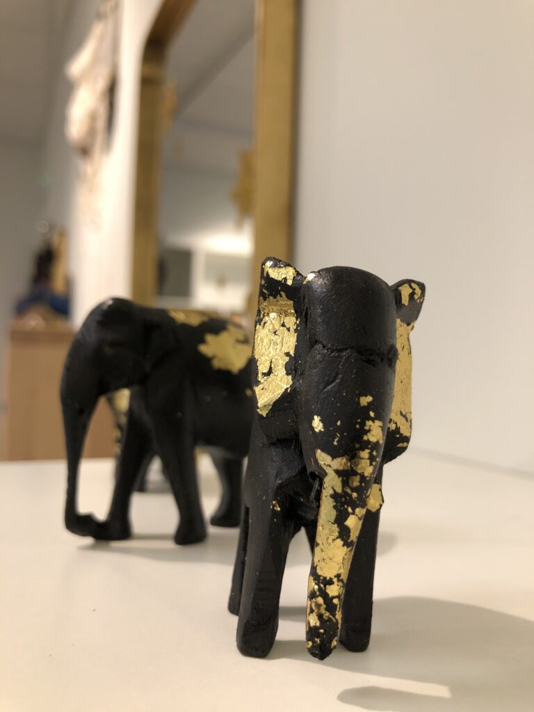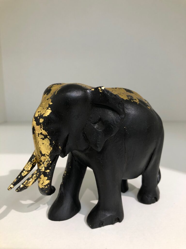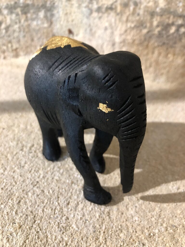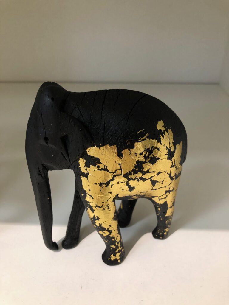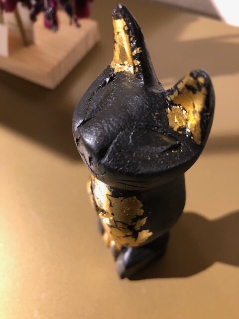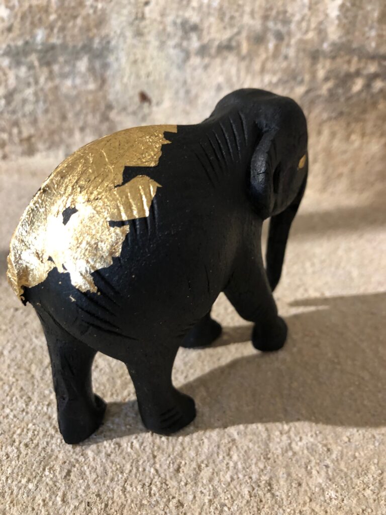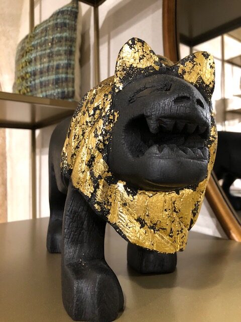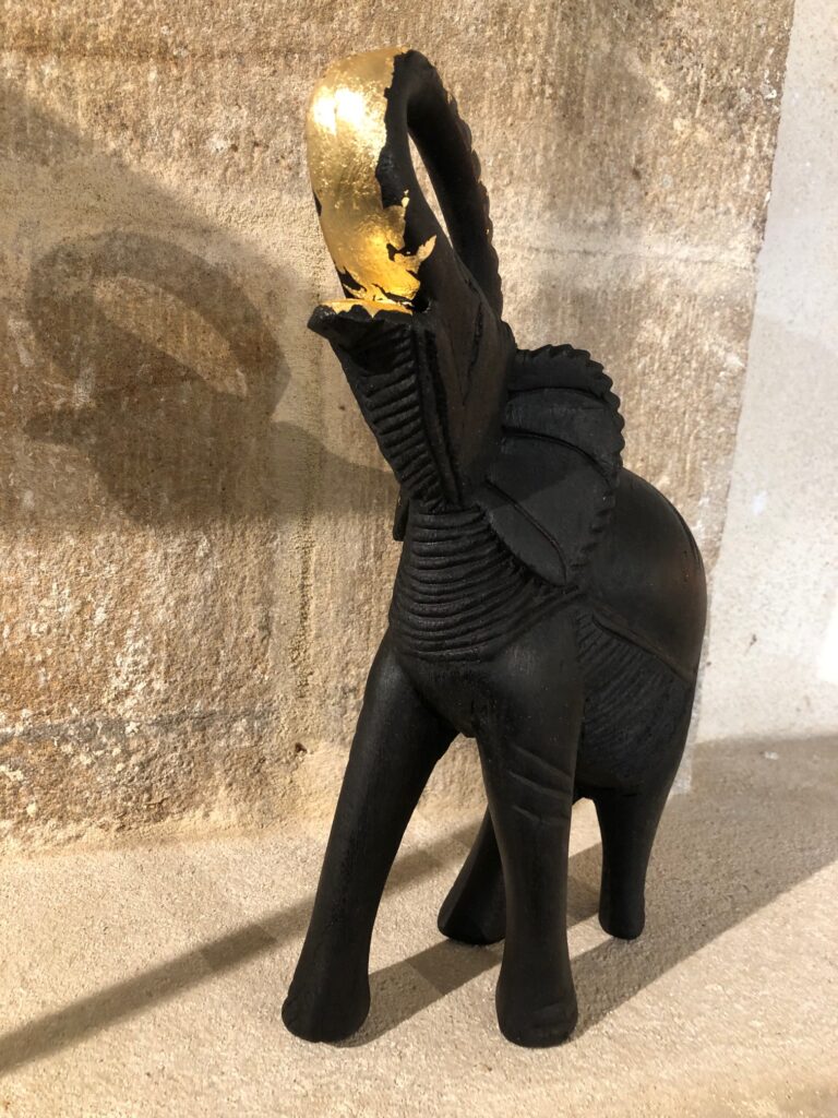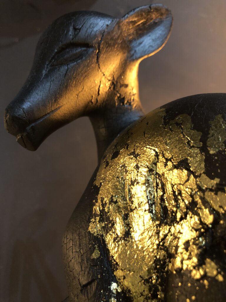 Je chine des animaux en bois sculptés, abandonnés ou mis au rebus, pour leur offrir une seconde vie dans l’esprit du wabi-sabi. Ces pièces oubliées, porteuses d’une histoire et de traces du temps, deviennent sous mes mains des œuvres où l’or et le feu révèlent leur splendeur cachée.