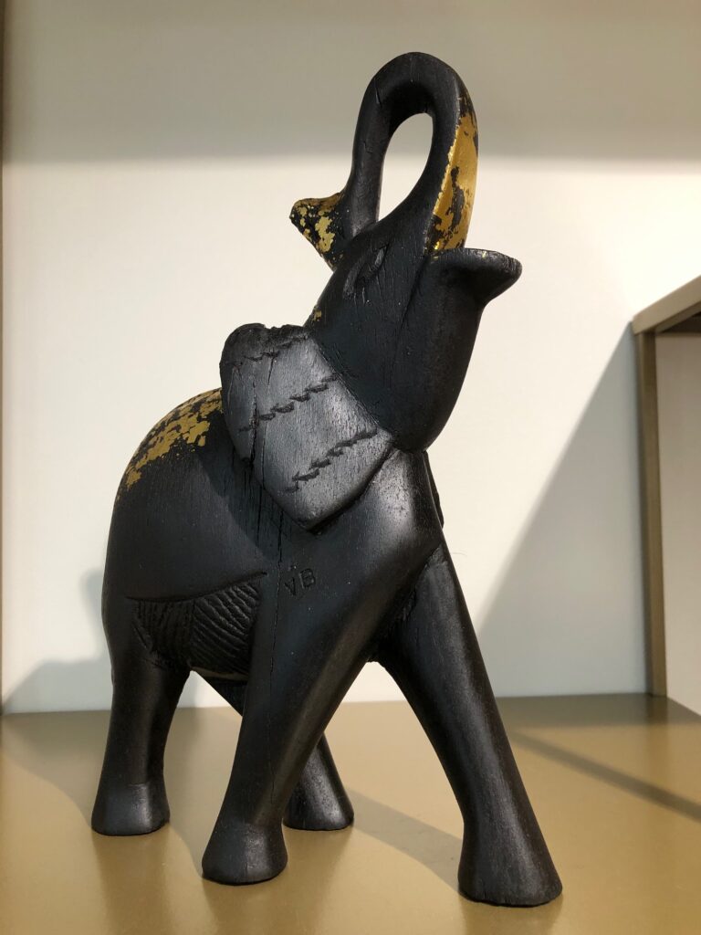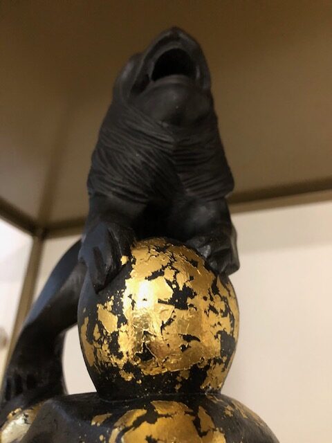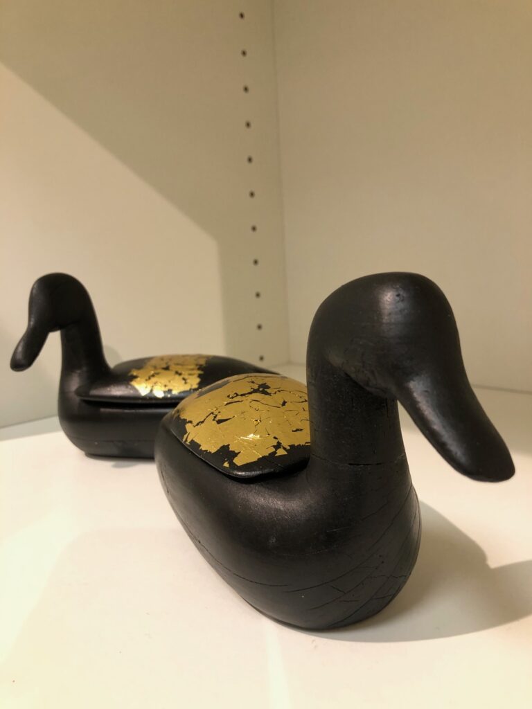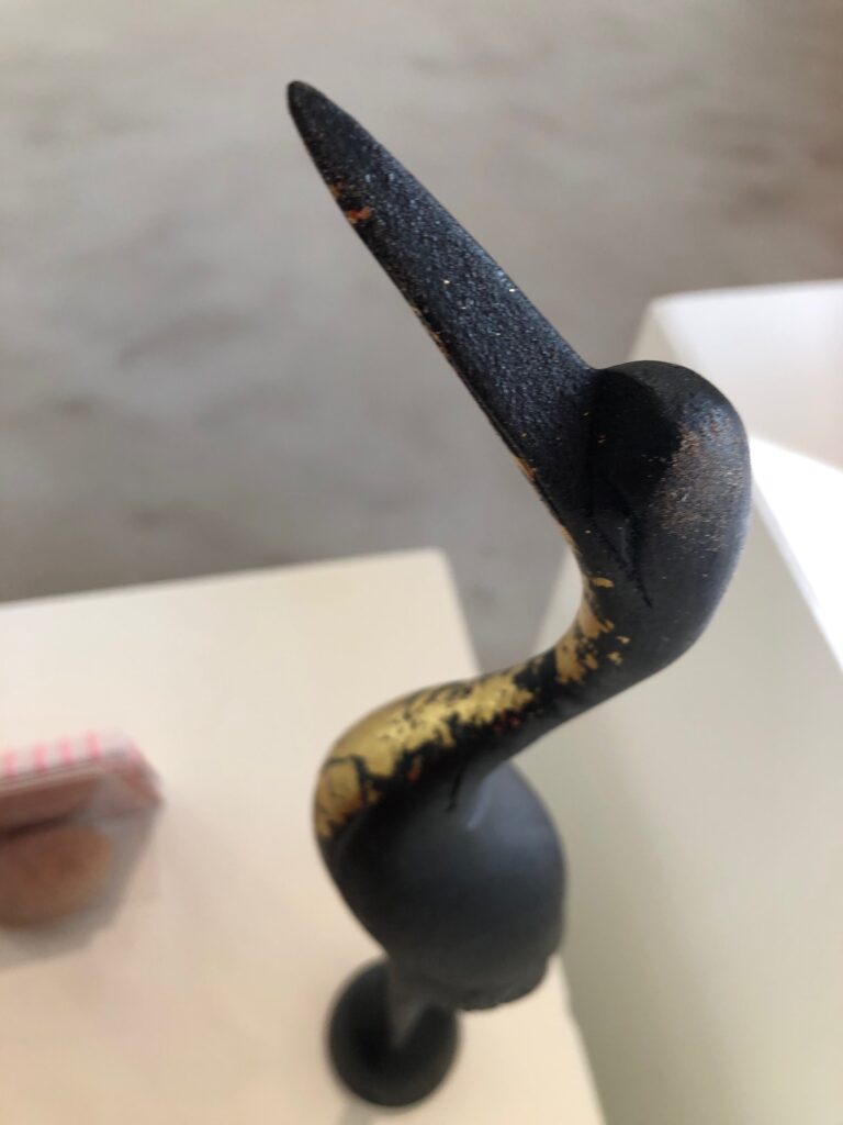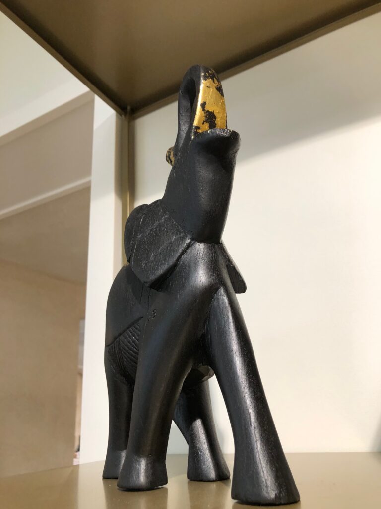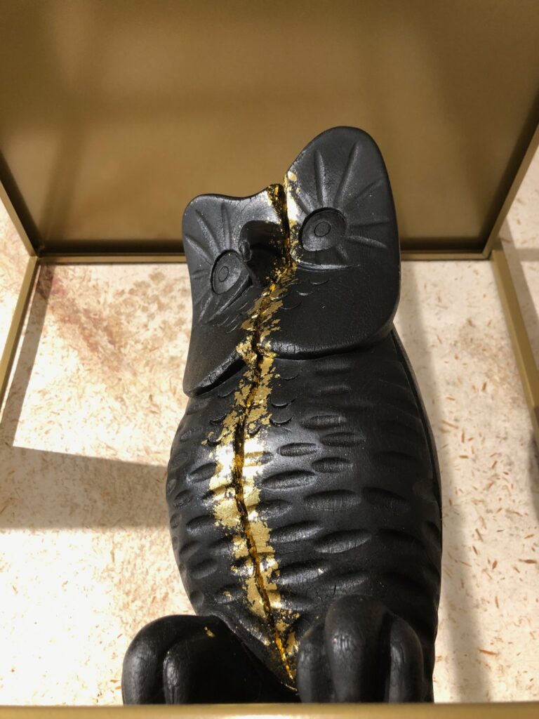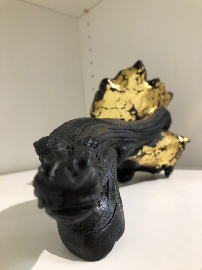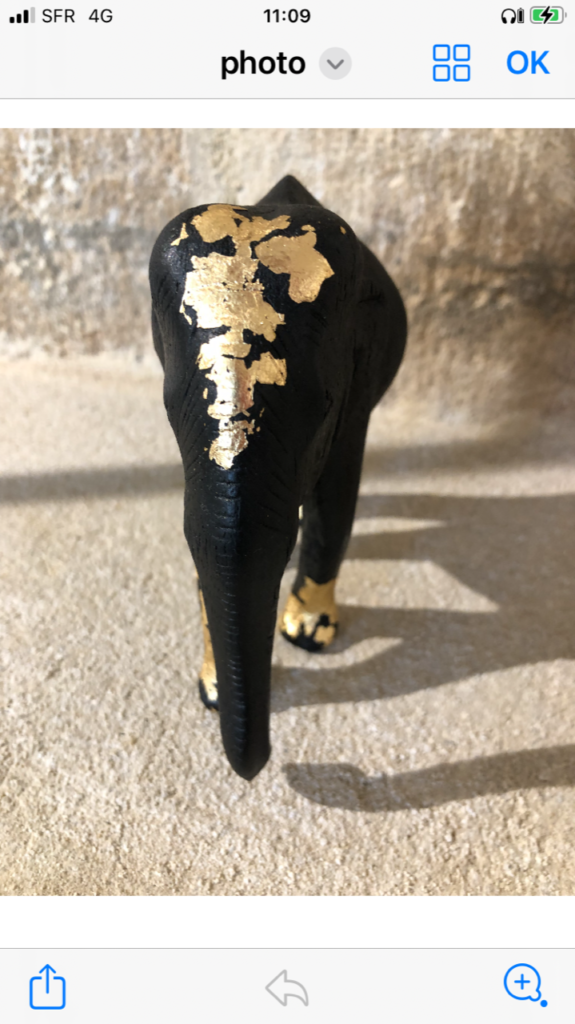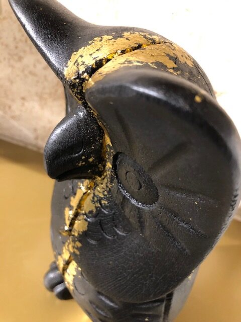 Je chine des animaux en bois sculptés, abandonnés ou mis au rebus, pour leur offrir une seconde vie dans l’esprit du wabi-sabi. Ces pièces oubliées, porteuses d’une histoire et de traces du temps, deviennent sous mes mains des œuvres où l’or et le feu révèlent leur splendeur cachée.