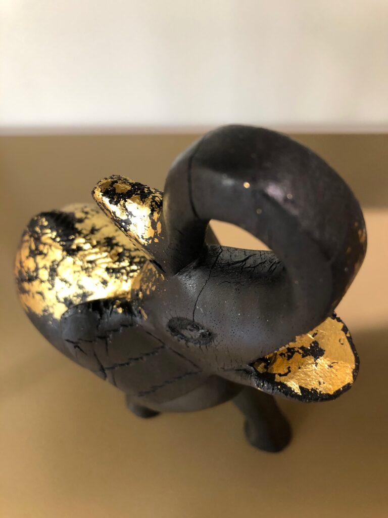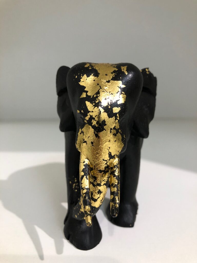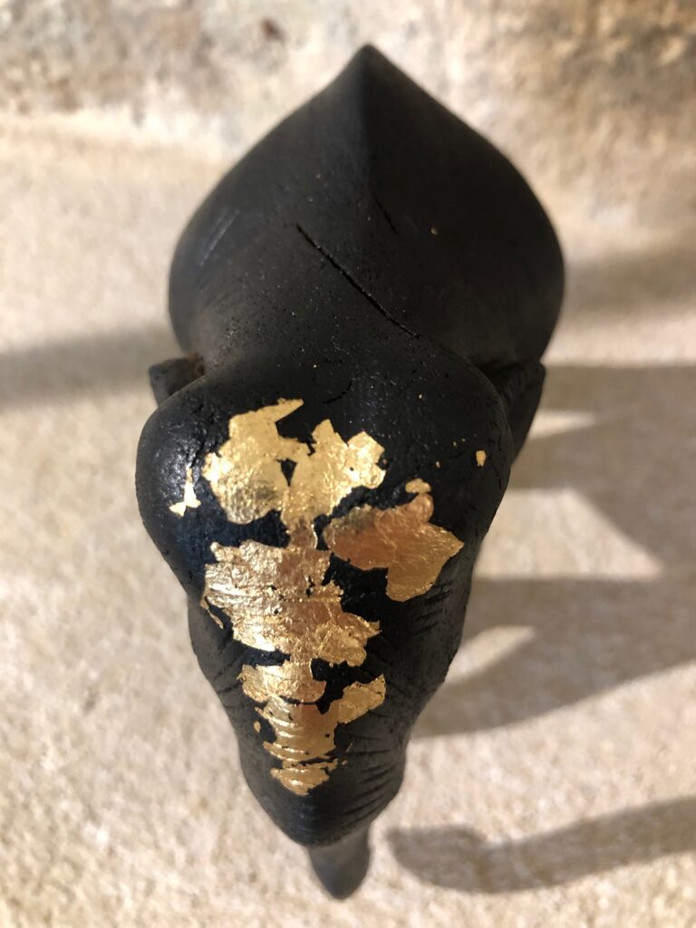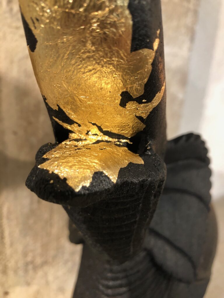 La collection « Animaux Sacrés » est une série de sculptures en bois brûlé et rehaussées de feuilles d’or 18 carats ou 24 carats, célébrant la beauté des imperfections. Chaque pièce est unique : les textures carbonisées du bois, les craquelures et les aspérités naturelles sont sublimées par l’éclat doré, créant un dialogue entre lumière et ombre, permanence et éphémère.
