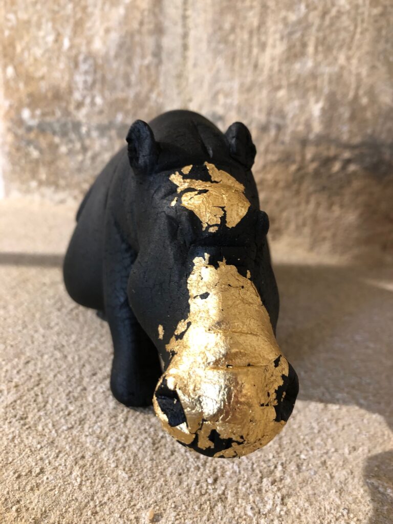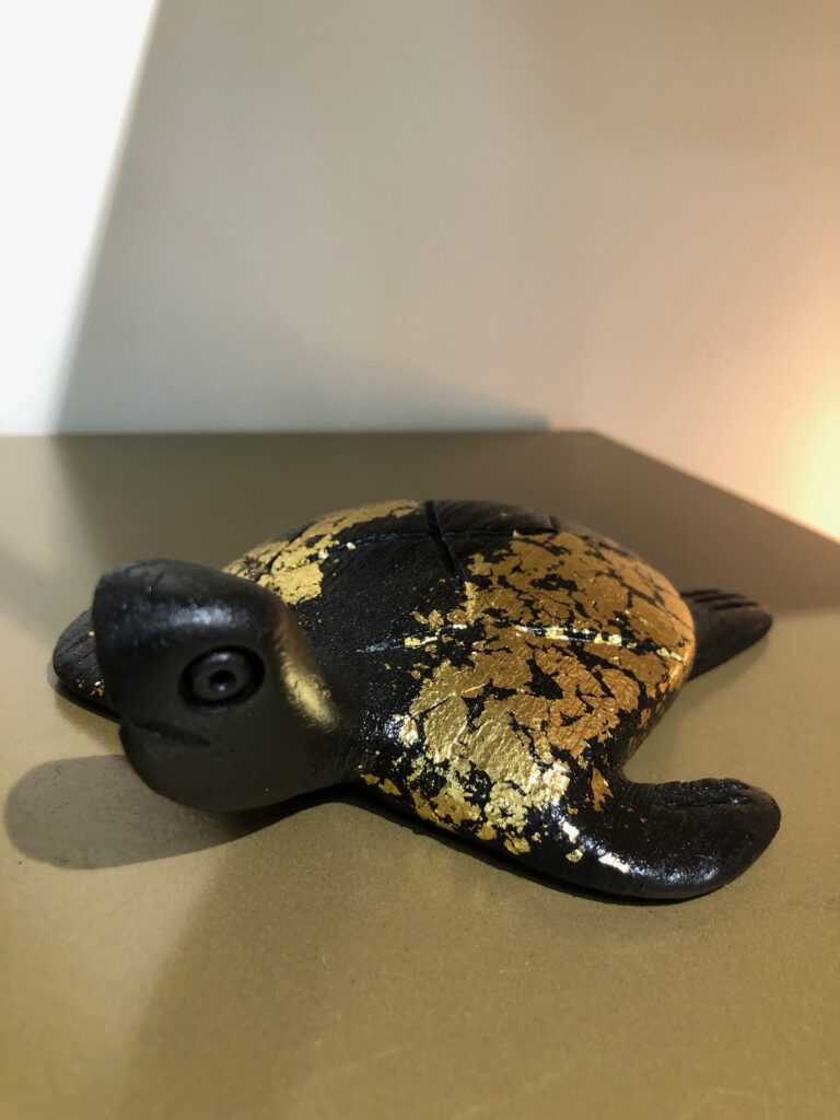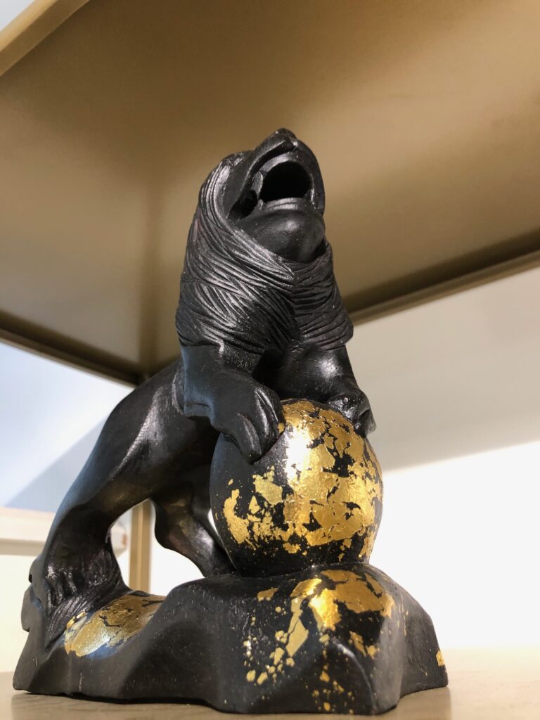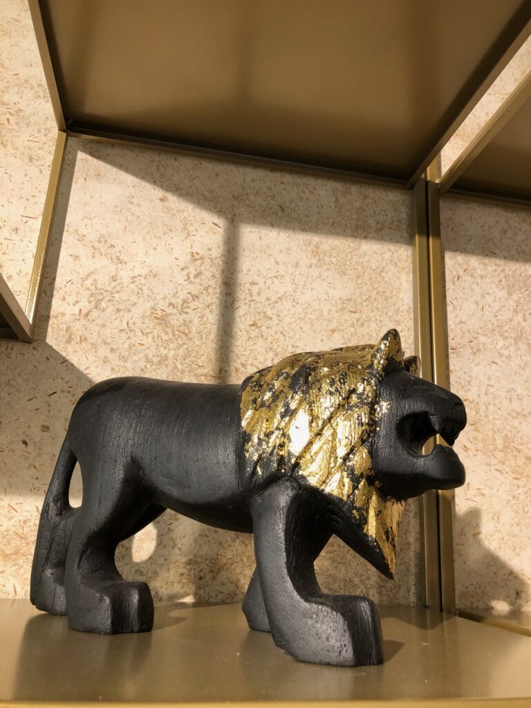 La collection « Animaux Sacrés » est une série de sculptures en bois brûlé et rehaussées de feuilles d’or 18 carats ou 24 carats, célébrant la beauté des imperfections. Chaque pièce est unique : les textures carbonisées du bois, les craquelures et les aspérités naturelles sont sublimées par l’éclat doré, créant un dialogue entre lumière et ombre, permanence et éphémère.