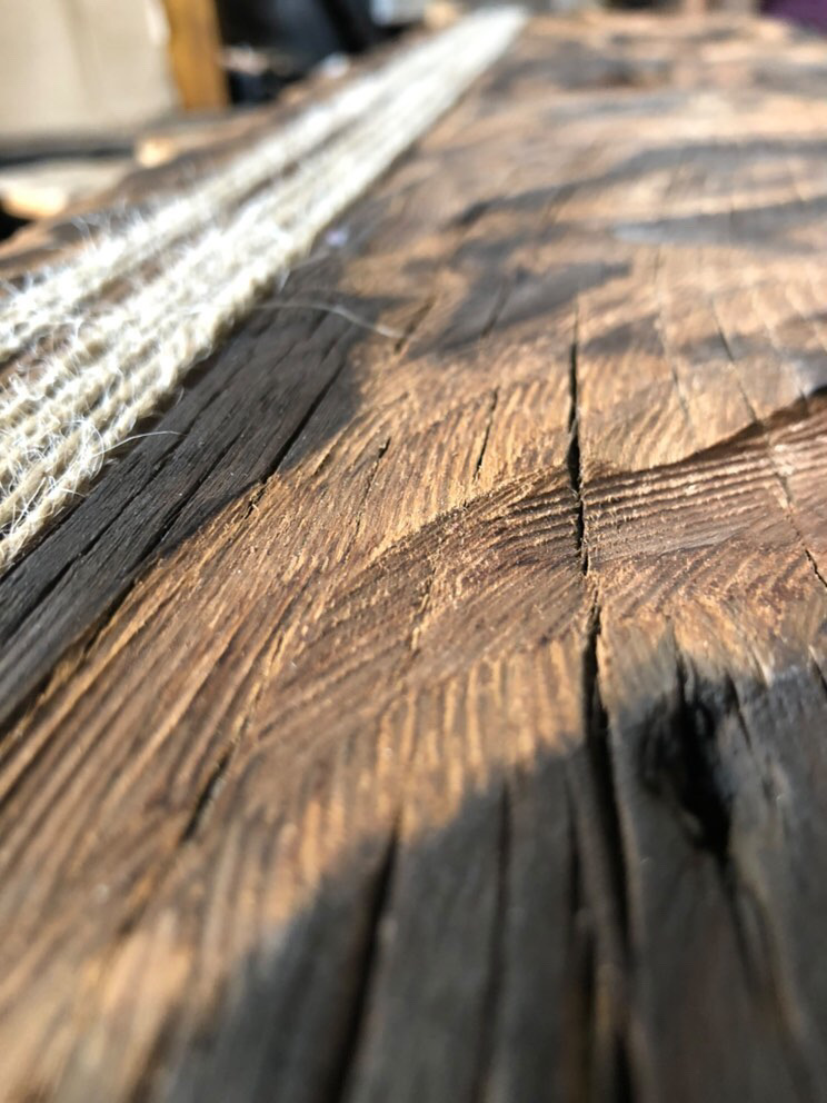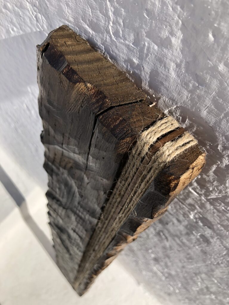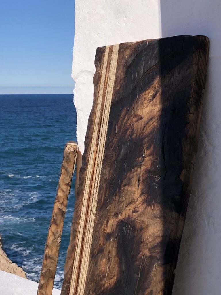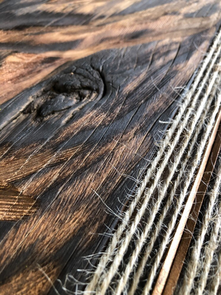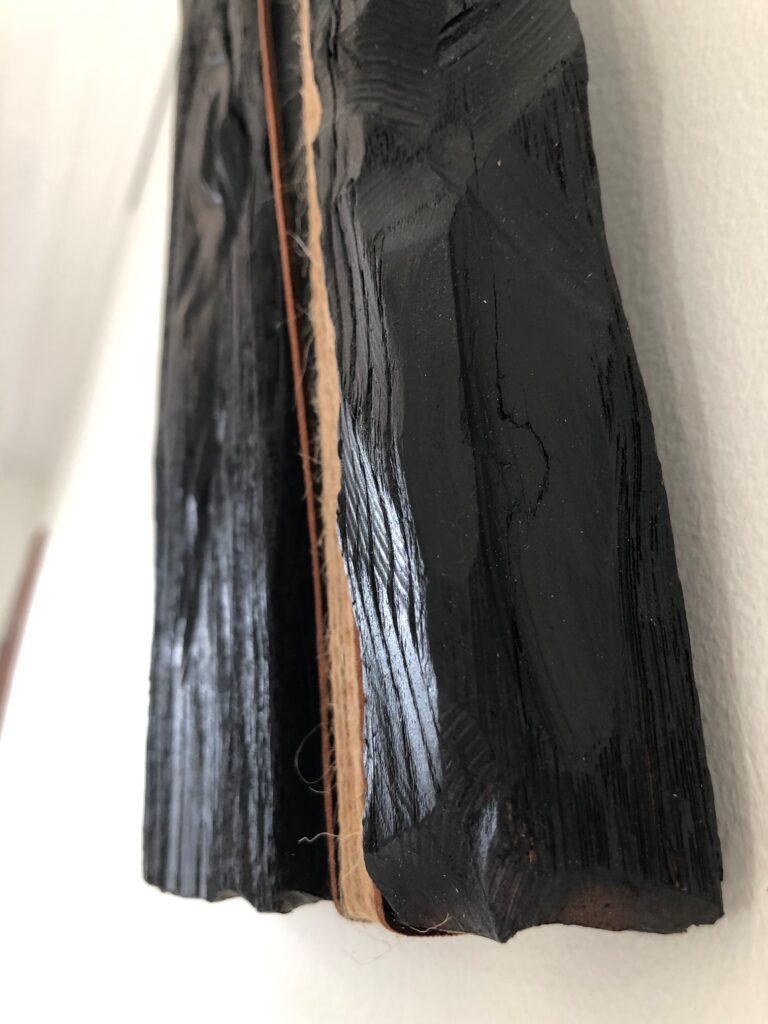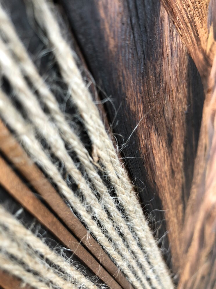 Ces tableaux naissent de châtaigniers centenaires, arrachés aux charpentes des vieilles maisons de Lozère. Des bois usés par le temps, marqués par les saisons, que je refuse de voir disparaître. Je les récupère, les sculpte, les brûle au rythme du Shou Sugi Ban, puis les caresse de fils de cuir, de coton, de chanvre — des matières brutes qui s’entrelacent comme des mémoires. Chaque pièce est une résurrection : le feu y creuse des sillons noirs, les outils y tracent des reliefs, et les fibres textiles y tissent des ponts entre rusticité et élégance.