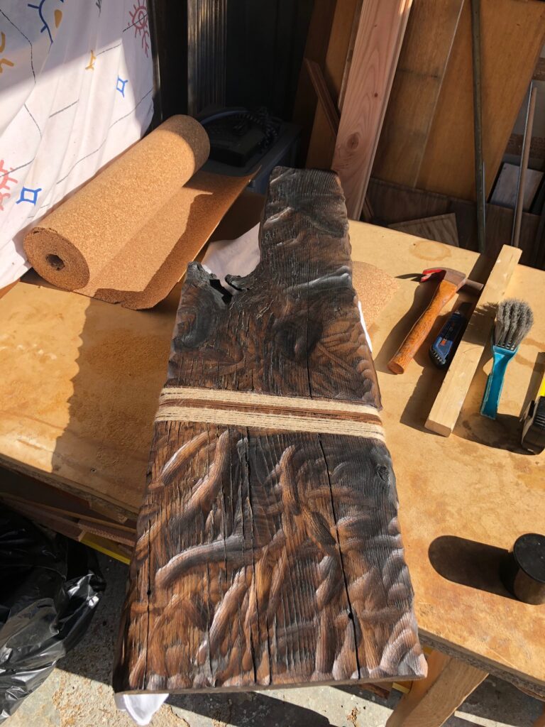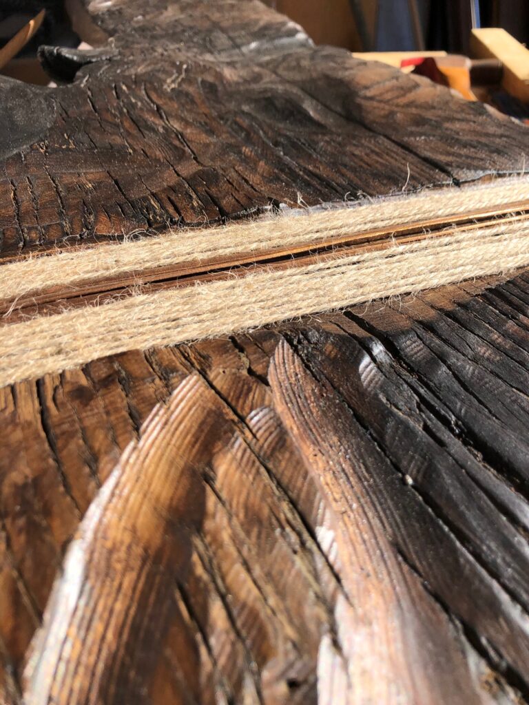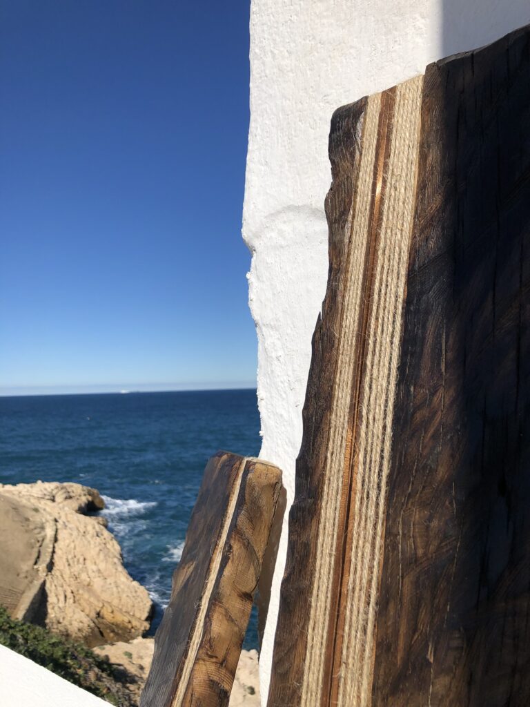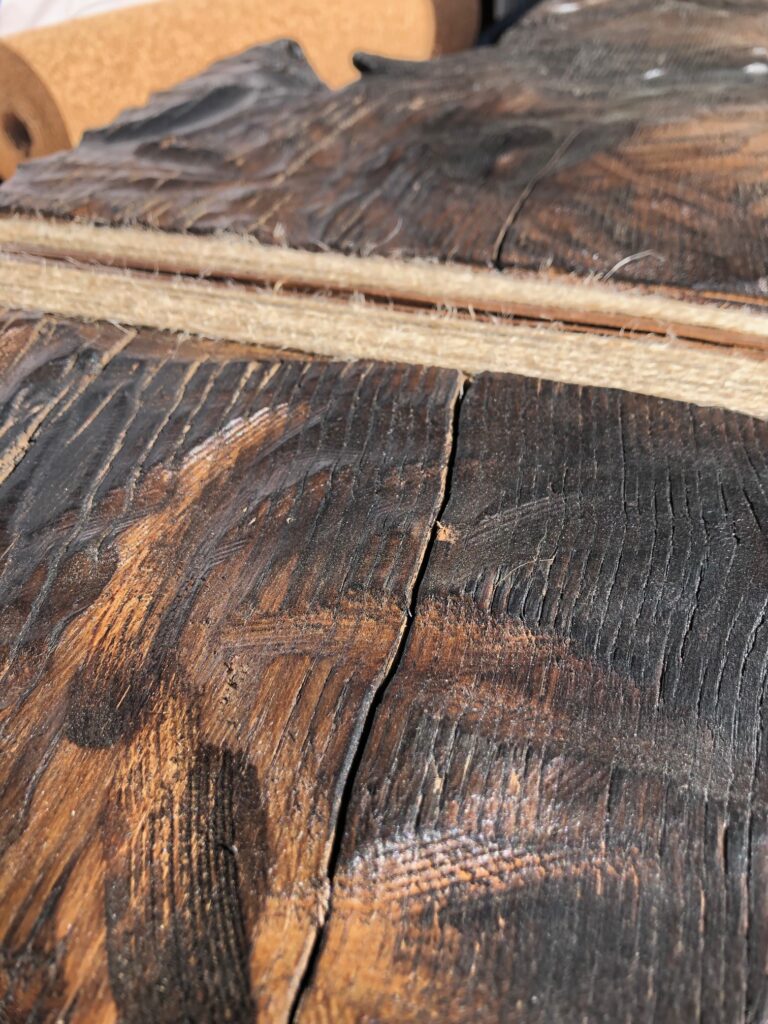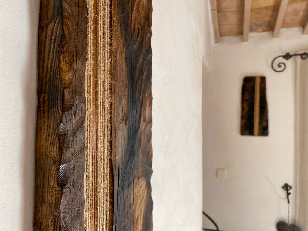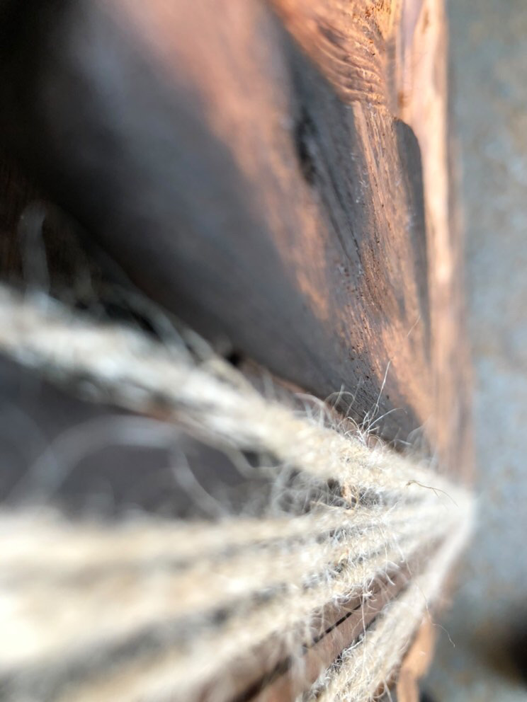 Ces tableaux naissent de châtaigniers centenaires, arrachés aux charpentes des vieilles maisons de Lozère. Des bois usés par le temps, marqués par les saisons, que je refuse de voir disparaître. Je les récupère, les sculpte, les brûle au rythme du Shou Sugi Ban, puis les caresse de fils de cuir, de coton, de chanvre — des matières brutes qui s’entrelacent comme des mémoires. Chaque pièce est une résurrection : le feu y creuse des sillons noirs, les outils y tracent des reliefs, et les fibres textiles y tissent des ponts entre rusticité et élégance.