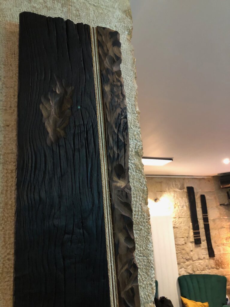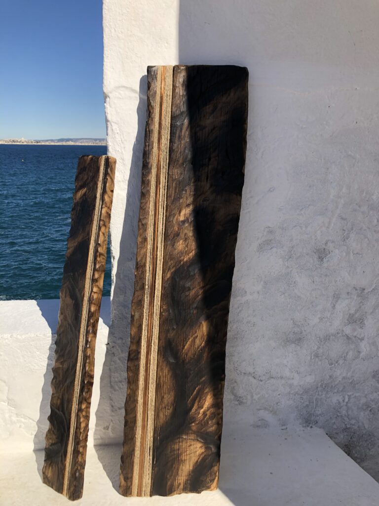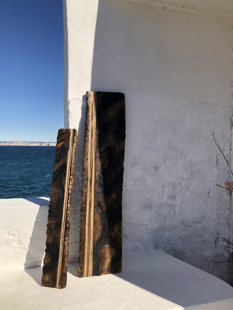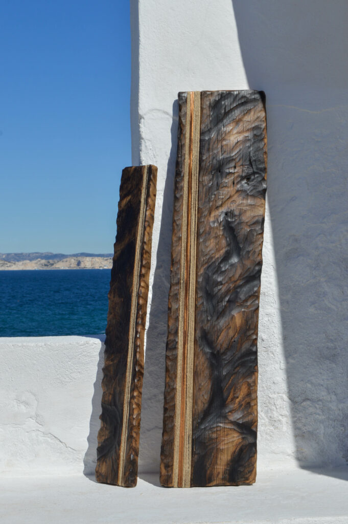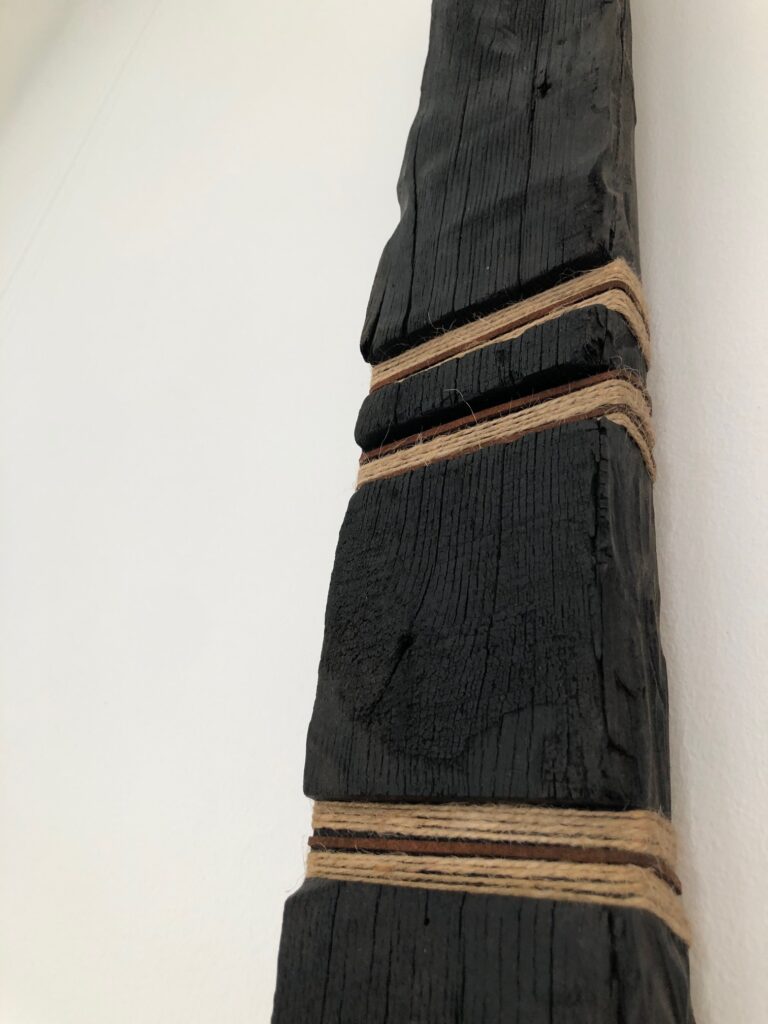 Ici, rien n’est lisse. Tout est trace, cicatrice, dialogue entre la rudesse du bois carbonisé et la douceur des fils qui s’y enroulent. Les textures se répondent — rugosité des flammes, souplesse des fibres — pour créer une esthétique à la fois sauvage et contemporaine, où le design épouse l’émotion.