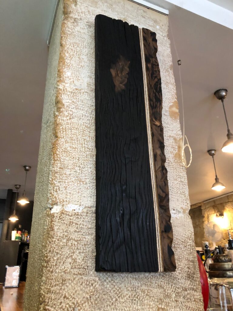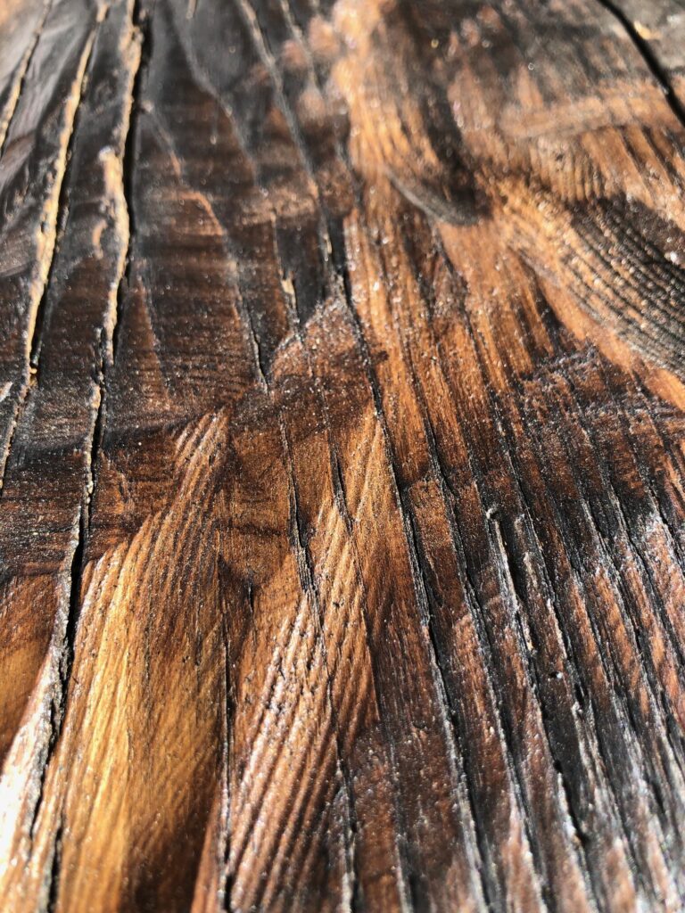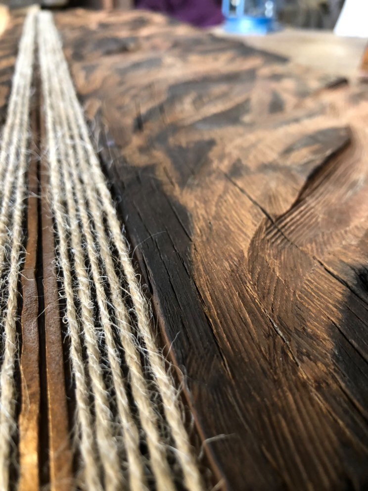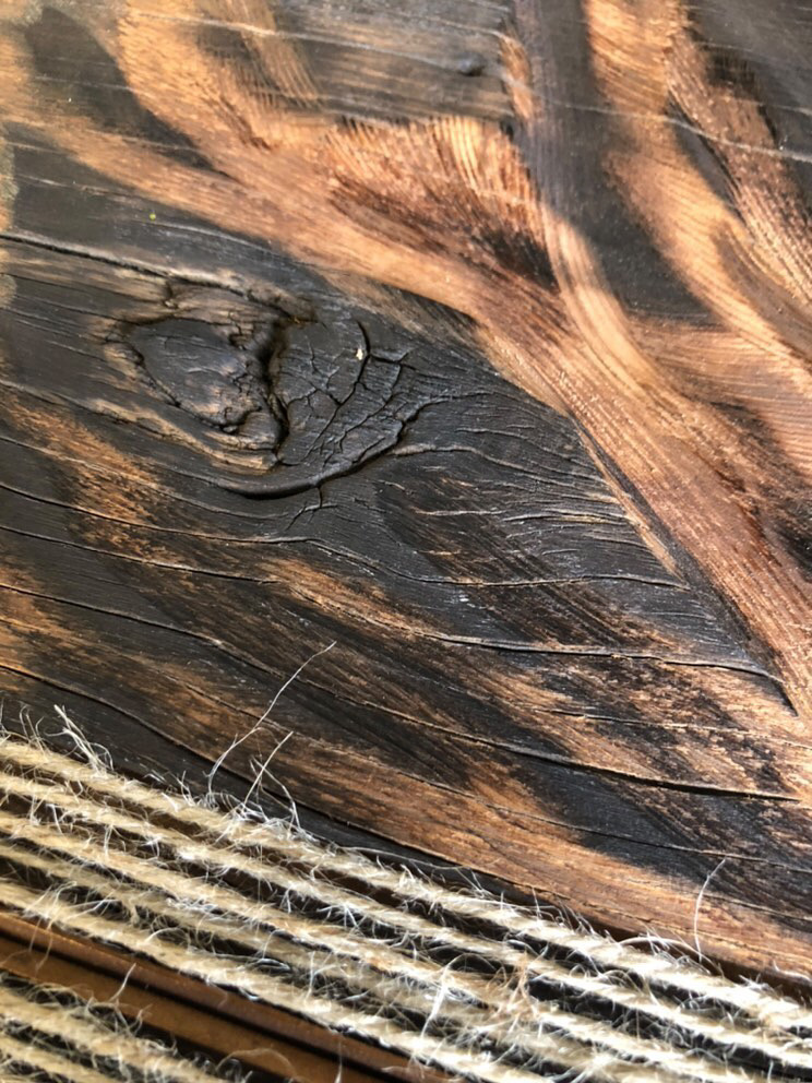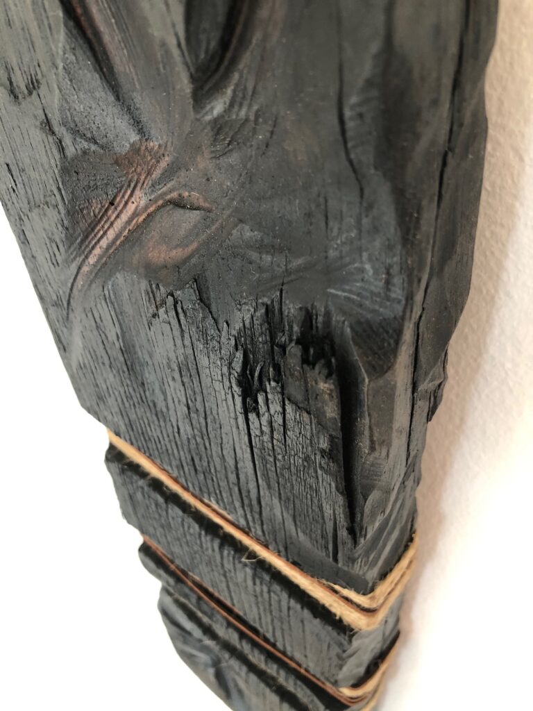 Ici, rien n’est lisse. Tout est trace, cicatrice, dialogue entre la rudesse du bois carbonisé et la douceur des fils qui s’y enroulent. Les textures se répondent — rugosité des flammes, souplesse des fibres — pour créer une esthétique à la fois sauvage et contemporaine, où le design épouse l’émotion.